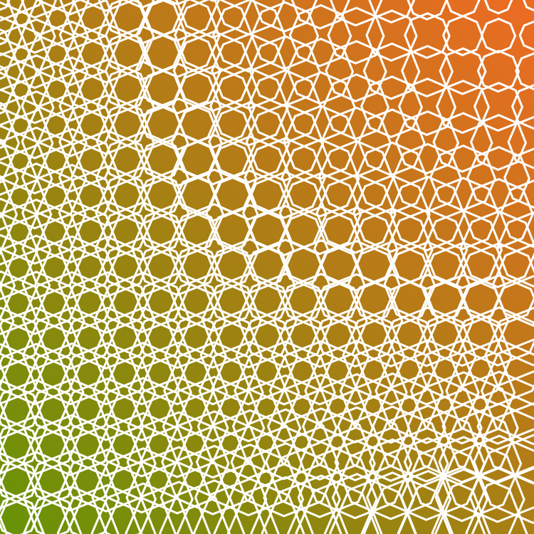 Tessellation with polygons of variable size, controlled with bilinear interpolation with a twist on a random color gradient background.