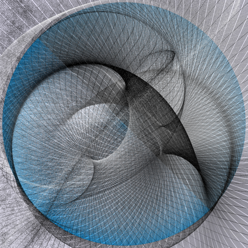 A second layer is added: beneath these curving, sinuous lines, points are plotted close to the limit of a circle, nearly filling the canvas. Its edges coincide with one of the points of the curves, producing an eclipsed planet; the lines seeming to dip behind its horizon.