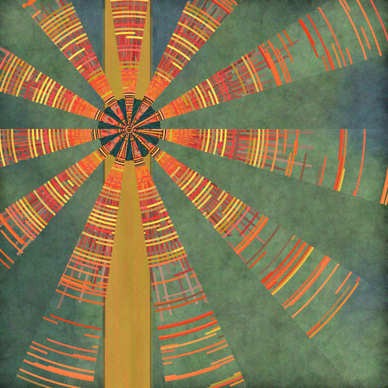 Radiant was created generatively in p5.js. Seven possible radial designs overlap on two canvases. On the top canvas, circles or arcs are erased to reveal the canvas below. There are four ways the background gets created, mostly using Perlin noise to pick colors from the palette. There are 34 hand-crafted palettes of 7 colors each.