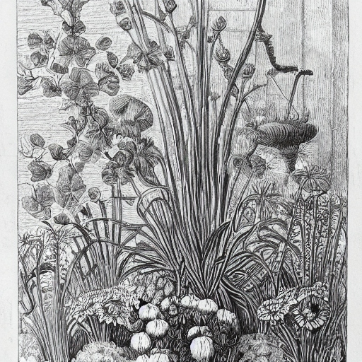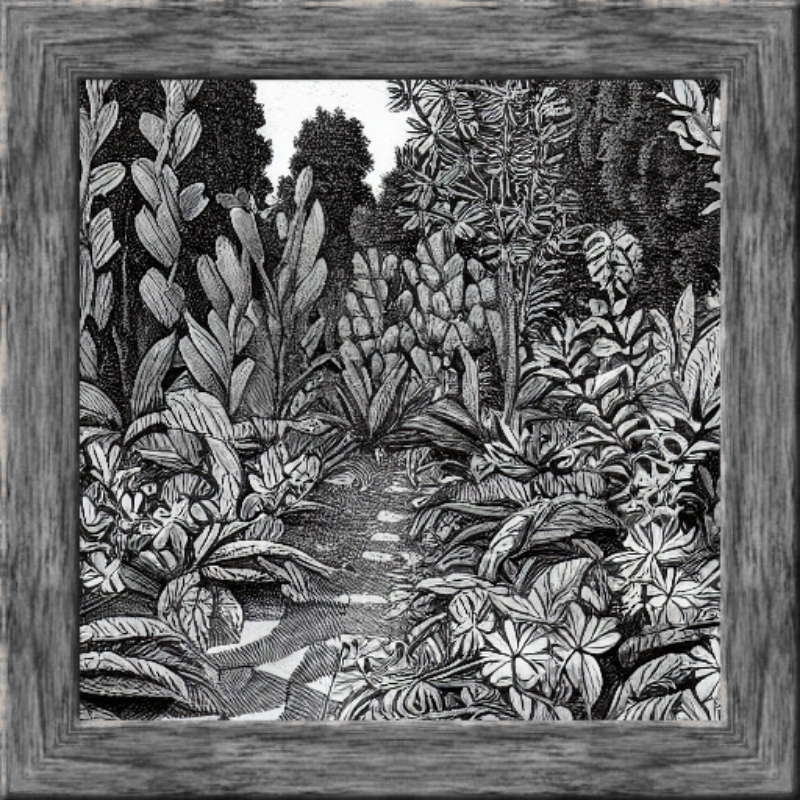 Natural elements such as trees, plants, flowers and forests in random generated stylistic black and white sketches and framed for visual display.