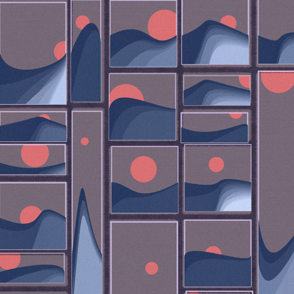 'a day in the life' captures various perspectives of the same mountain range, tiled in uniquely interesting ways. Though it presents a minimal, abstract front, most elements are composed of thousands of small lines constrained by curves and shapes.