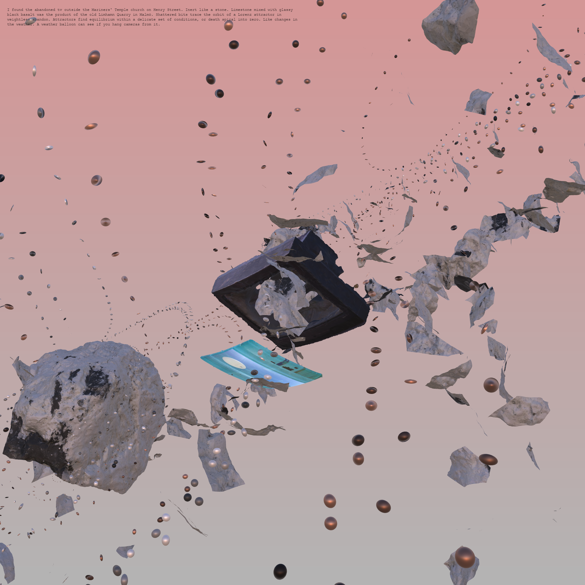 A randomized composition of digital artifacts. Scans of limestone samples from Malmö, Sweden. A broken TV on the sidewalk in NYC. Original photography and textures. Stream of consciousness text. Lorenz attractors.