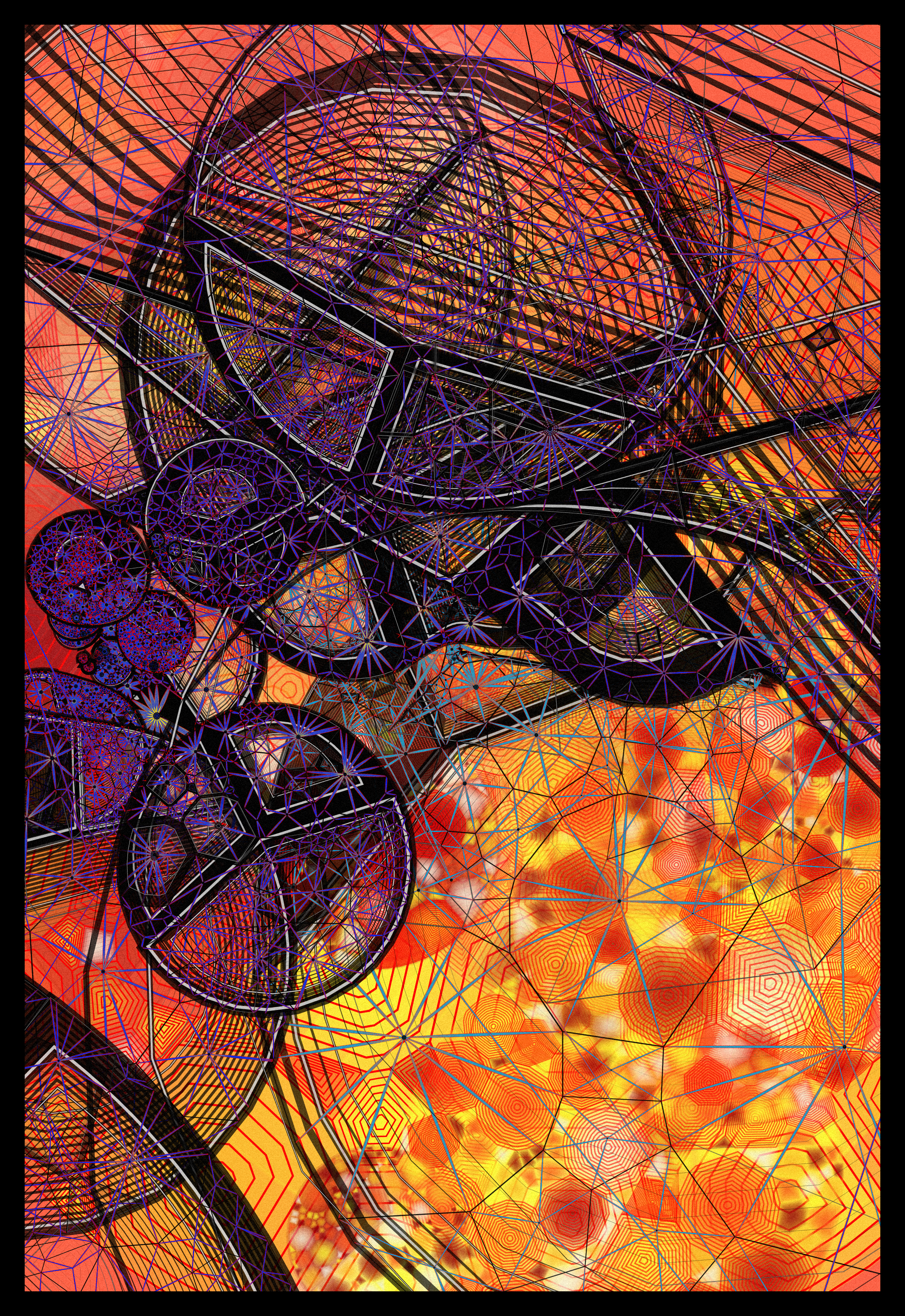The work is made using vanilla javascript with some use of D3.js and math.js. Hand-crafted conformal mapping techniques are used to warp benign geometries into fever dream constructs.