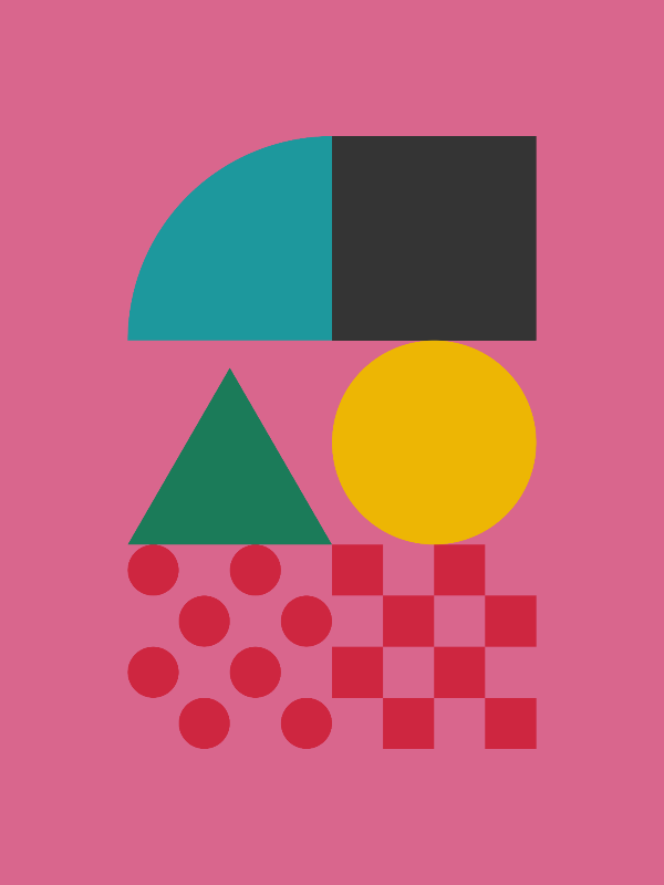 'Bayeux' explores the bold simplicity and beauty of Bauhaus design ideas, with an arrangment of simple bauhaus-inspired shapes in a colorful, striking design. The addition of smaller shapes arranged in a checkerboard style gives some outputs an heraldic feel.