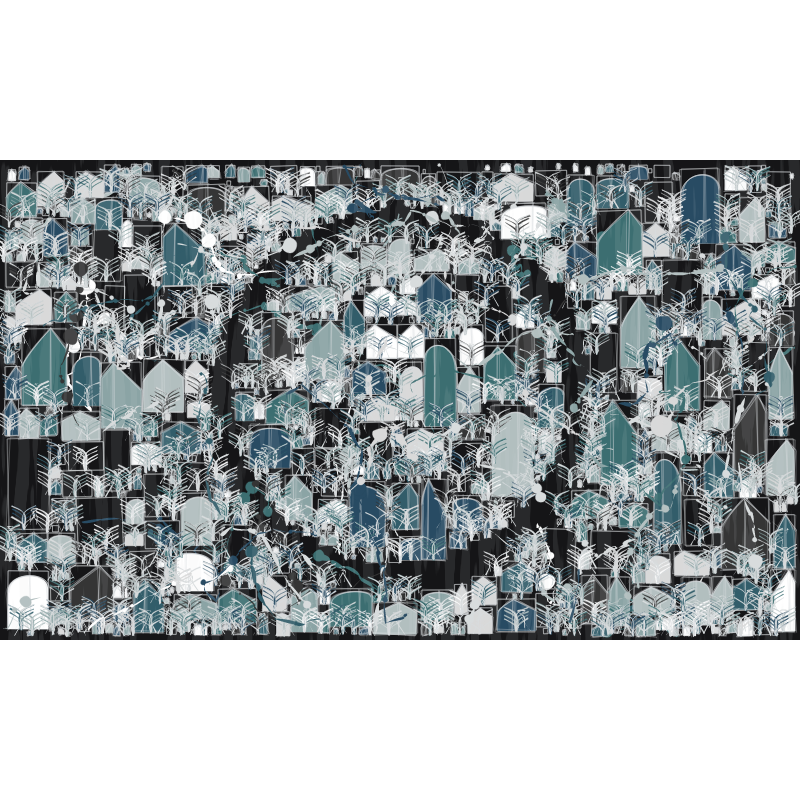 "City Plans" depicts the concept of how cities develop and expand through planning and design. It emphasizes the role of city planners and architects in shaping the built environment, and the idea that a city's growth and development is guided by a master plan or blueprint.