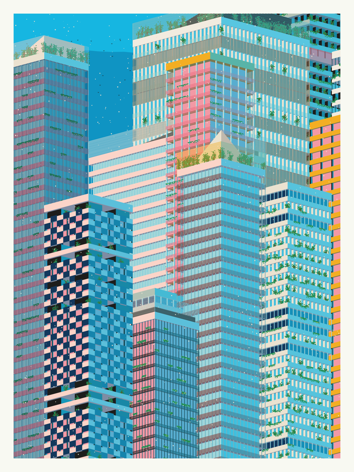 Despite depicting a stylised modern architectural language, at its core the collection serves as a homage to 1980s Japan, an era of unprecedented prosperity that left a lasting impression on the music and artwork of the time. Through the use of carefully created palettes and composition, the outputs intend to evoke feelings of optimism, while guiding viewers to consider why the essence of this era is so alluring in the present day as it continues to influence and inspire contemporary art.