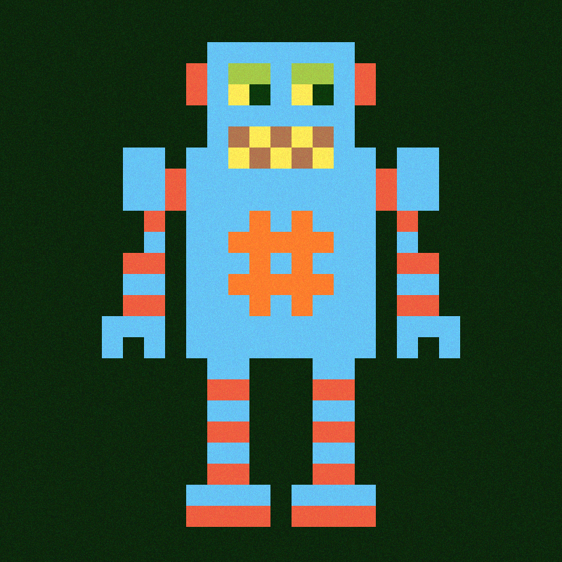 Uniquely generated robots featuring a glitched loading reveal. Features include 21 Palettes 8 Mouth Colors 4 Eye Colors and 4 Eye Styles 4 Background Colors 2 Granulation Levels