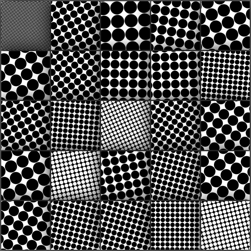 The canvas is split into small squares, separated by gridlines of uniform thickness. Each square is filled with a repeating pattern of dots. Rotation is applied, and some squares are inverted.