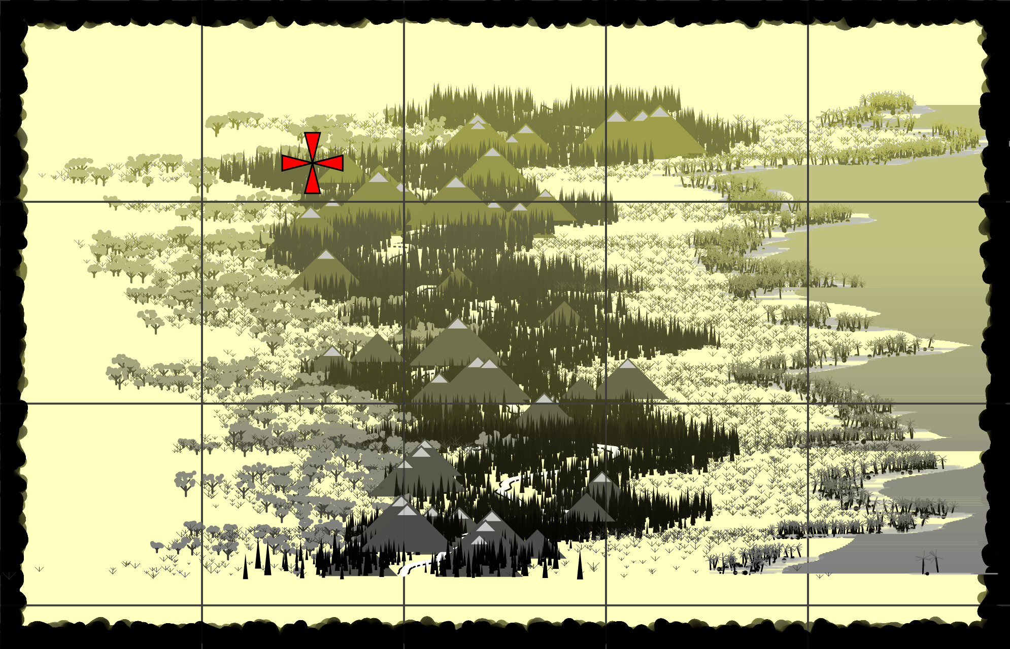 Generative icons fill a generative map. This token uses noise to describe regions of mountains, ocean, plains, forests, beaches, and a winding river. Once created, a treasure is randomly located and noted with a red treasure marker.