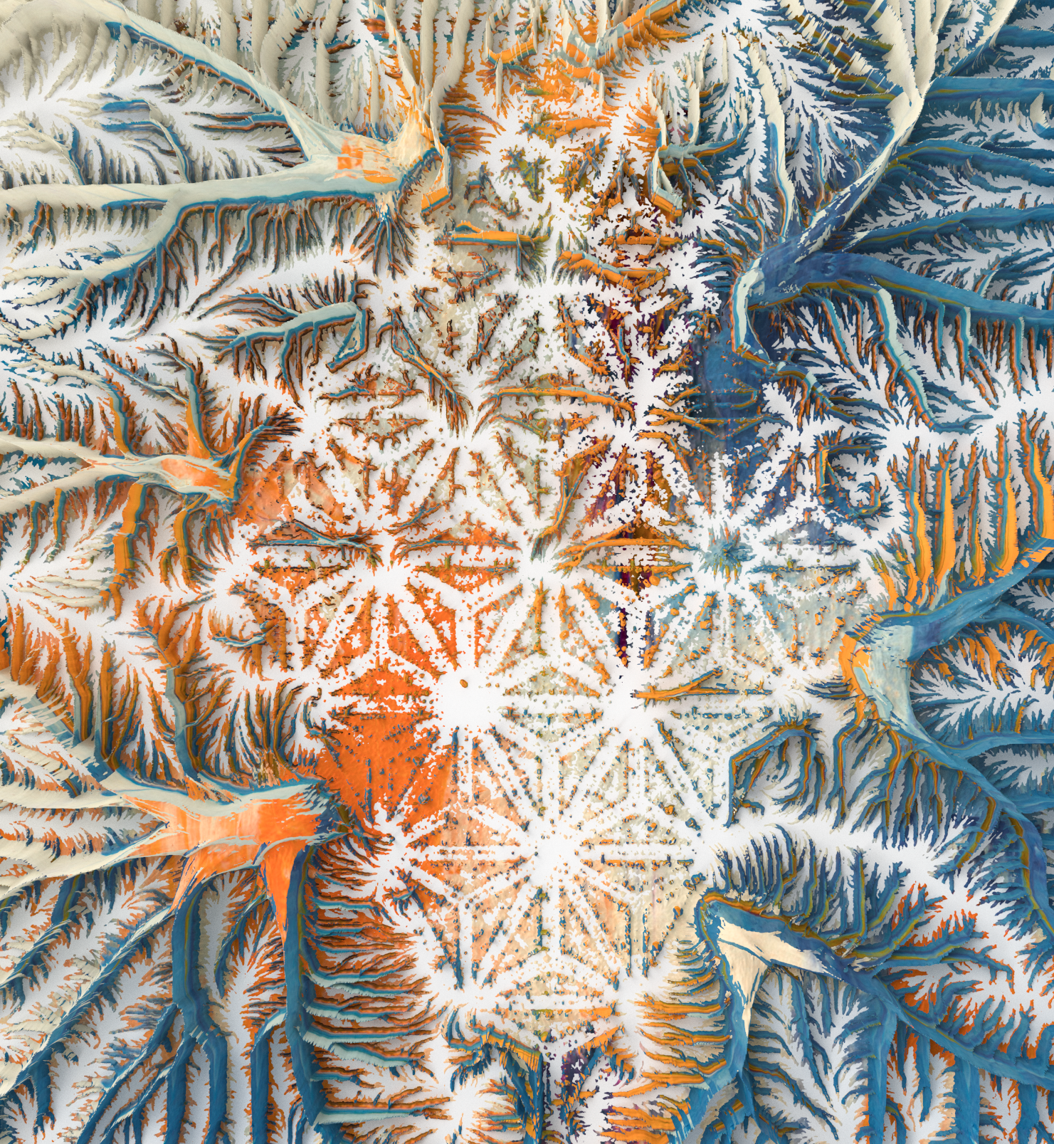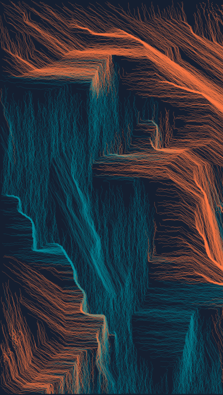 Algoscapes is an ongoing study in fostering an aesthetic of abstraction in landscapes through geometry and code. This piece builds on past work on generating abstract landscapes algorithmically. It is an attempt to capture the essence of naturally occurring rock-faces, to capture the diverse vocabularies ranging from the jagged edges of a mountain's summit to the flowing lines of a canyon wall. The result is a constantly evolving display of color and form, abstract yet reminiscent of the intricacies of the natural world.