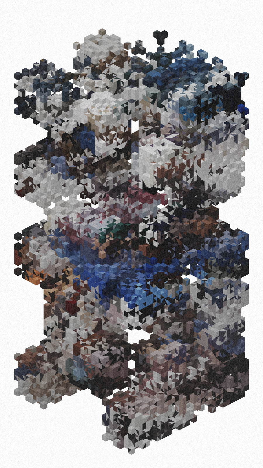 These monolithic structures also reflect natural 3D grids found in nature such as crystals and honeycombs,presenting a deconstructed, pixelated matrix of our universe.