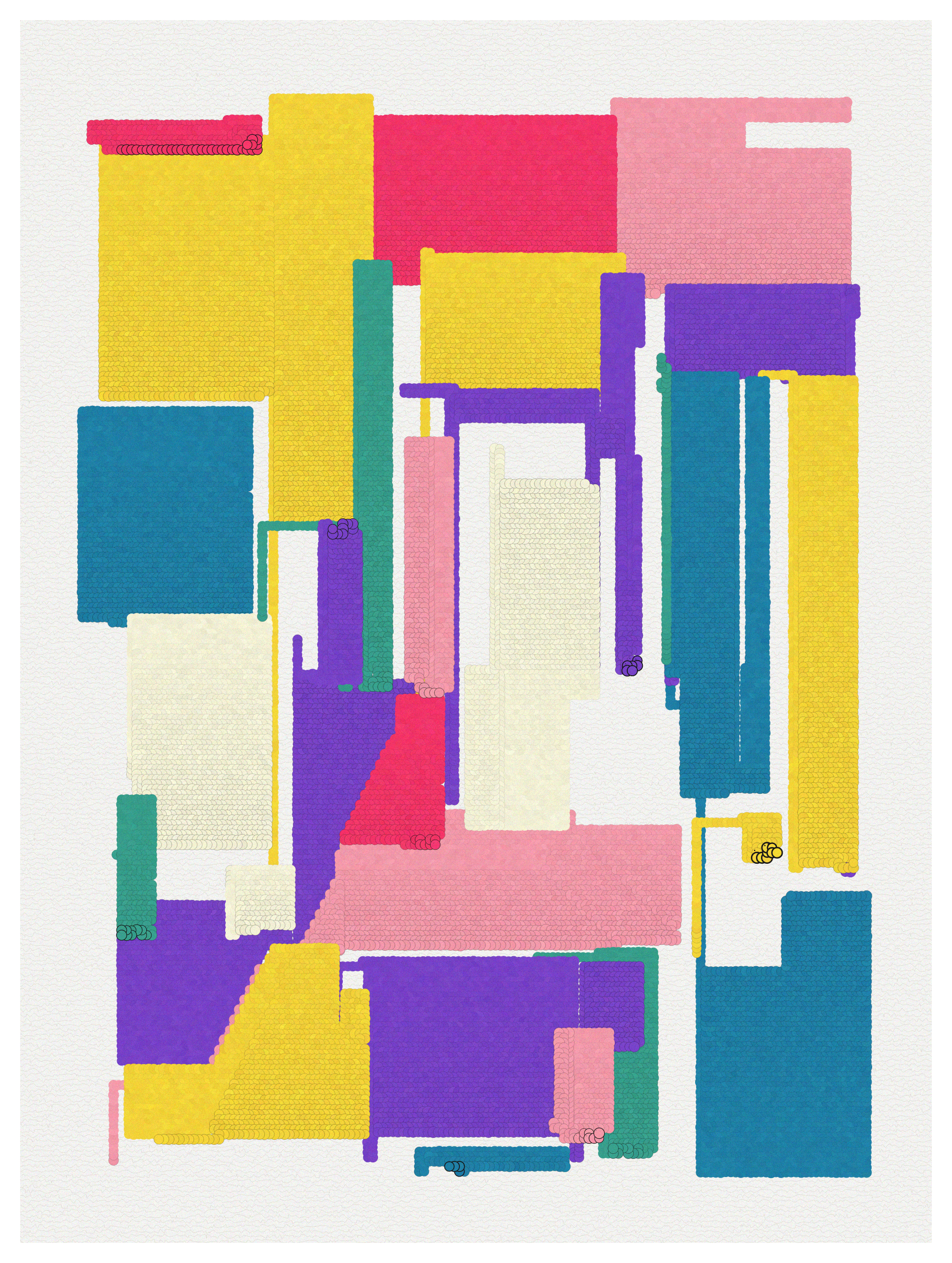 Shapes are drawn on a space-filling grid against other shapes, using a random walk algorithm. then they are separated with a random offset, hence the name counterforms (contraformas).