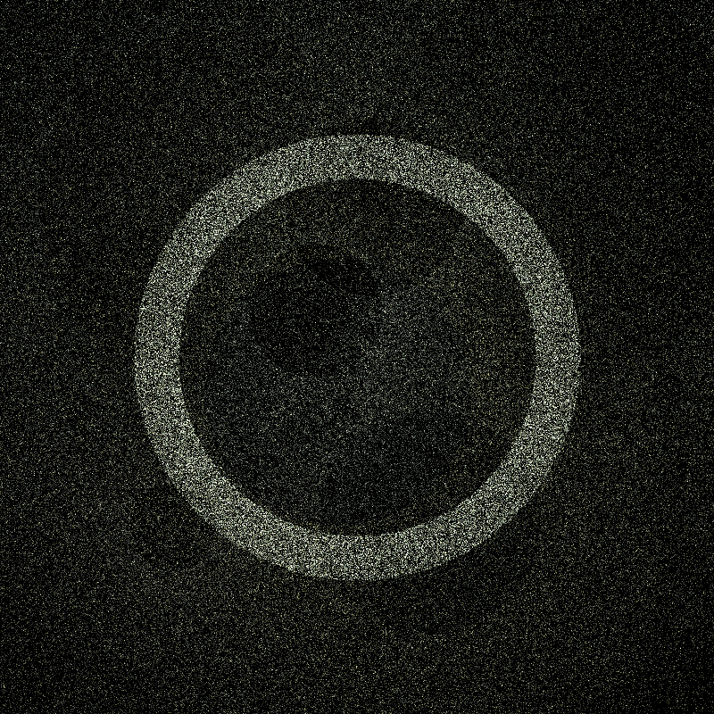 Pointillism, in a circular fashion. Several positions are created, and points are sprayed from those positions (plus radius). Simultaneously, one (and very occasionally two) rings are point-drawn with the final color in the stack. Traits include number of points, color palette, ring size, and whether there are one or two rings.