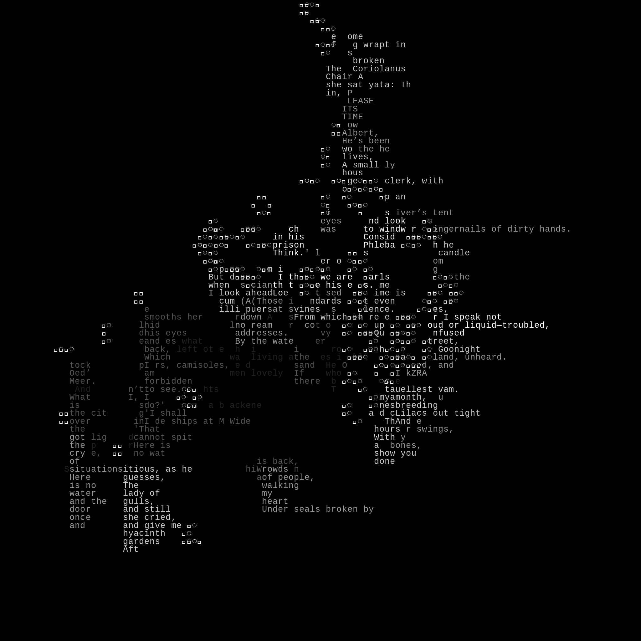 In this implementation of Game of Life, the grid is monospaced text, and each living cell has a very small chance of generating a few lines, all entirely inspired by The Waste Land. Each token will track its unique starting configuration's progress forever. The grid is infinite, and the dynamic patterns extend far beyond the fixed boundaries of your screen. Some tokens will remain dynamic for a very long time, while others will settle down quickly, at which point continuously living cells may iterate through nearly every Unicode character.