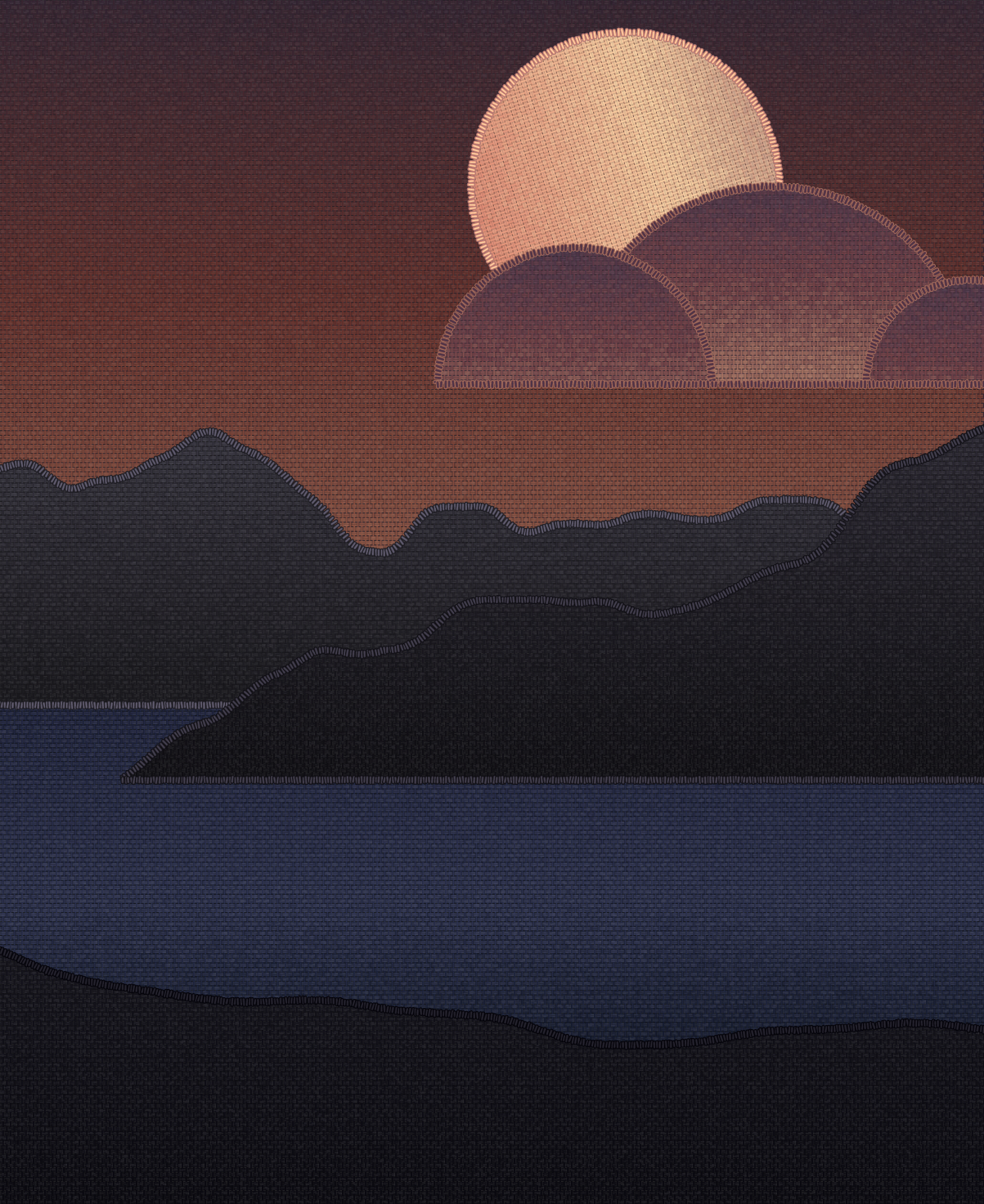 Soft, chenille like fabrics, ombre dyed with subtle shades, cut and sewn together with embroidery silks to suggest sky, sun, sea, islands and clouds...