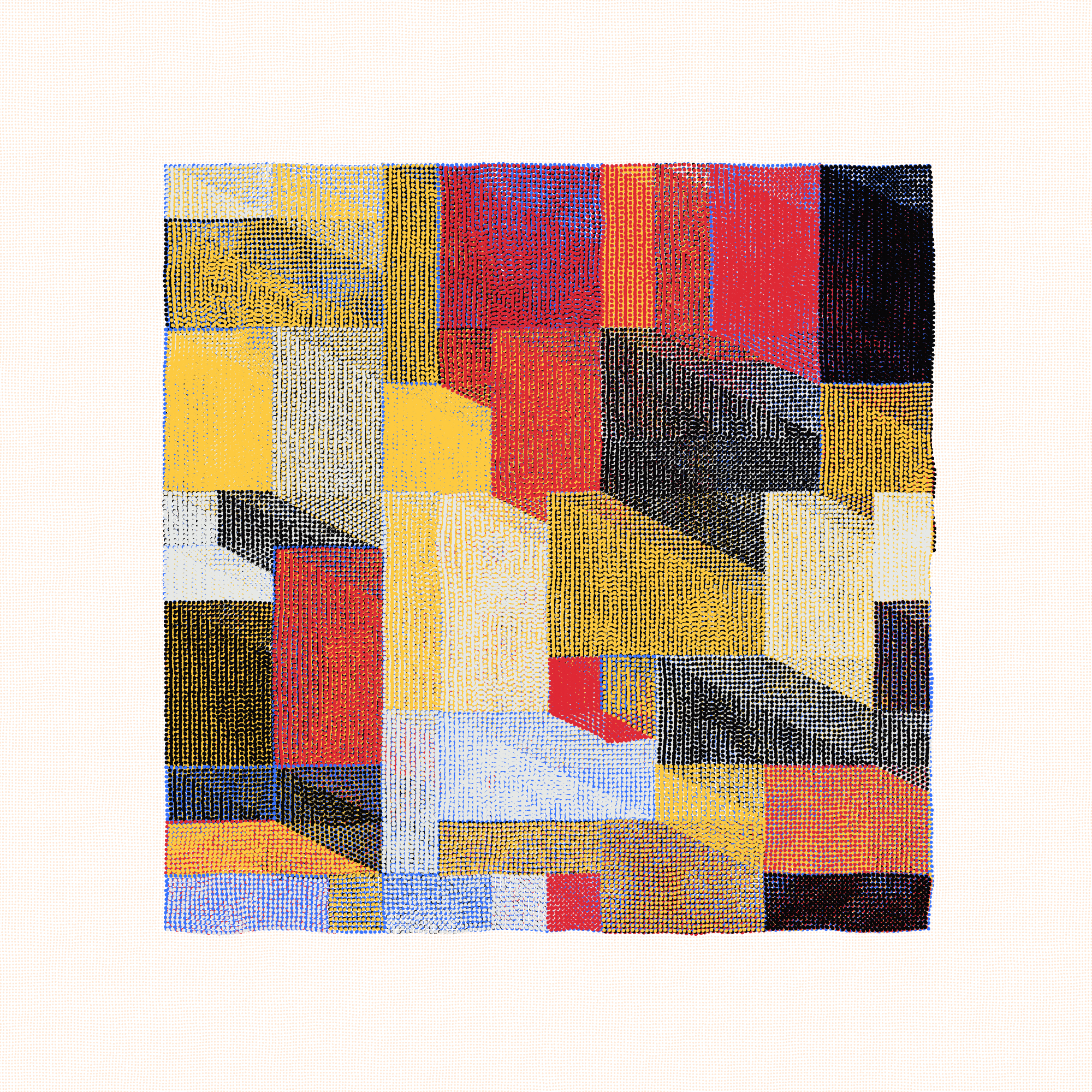At the heart of this work is a random composition of rectangles that are made up of dots. These pigments are arranged in multiple layers, each layer using a different color from one of the carefully curated color palettes. Each palette consists of three to five colors.