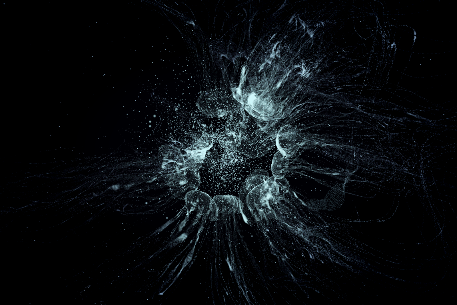This artwork portrays jellyfish intermixed with litter in the ocean, such as plastic bags and masks. The outputs offer variance in color, species, clarity, ratio, motion pattern, framing, and additional variables.