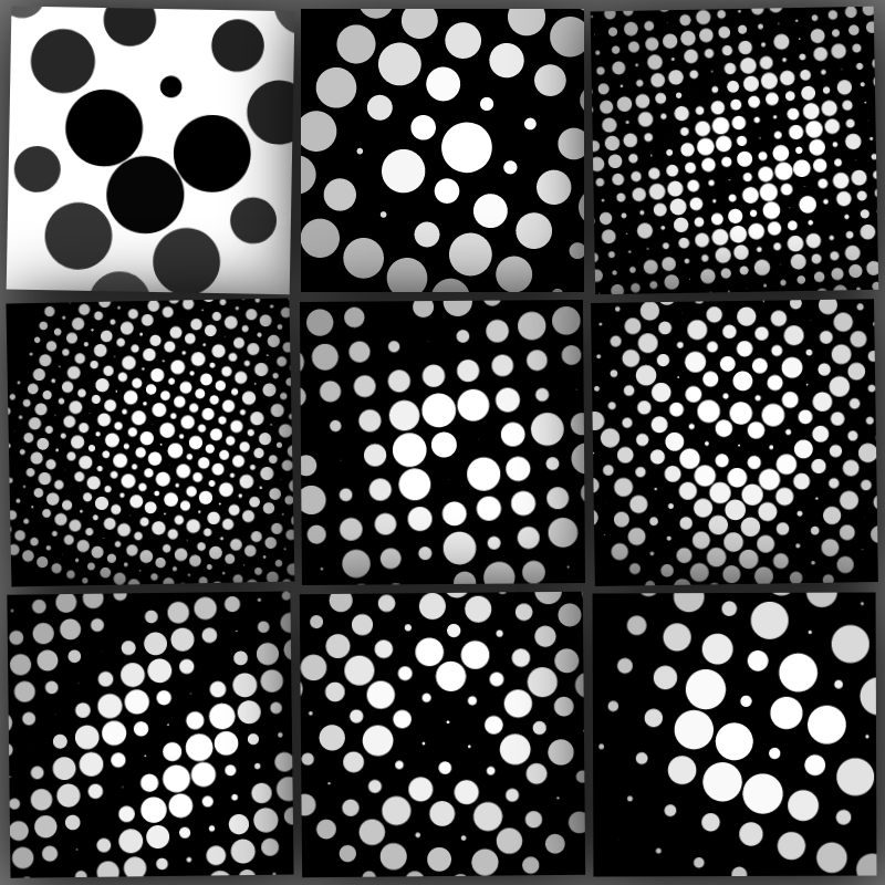 A canvas of squares, each one displaying a unique pattern of dots, constantly changing over time.