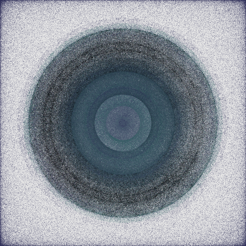 Stippling progresses. Points become rings and vignette. Traits include Division (number of events used to draw the rings; translates to complexity), Color Palette, and Offset (rings can be drawn in the center, or much less commonly, towards the top or bottom of the canvas.)