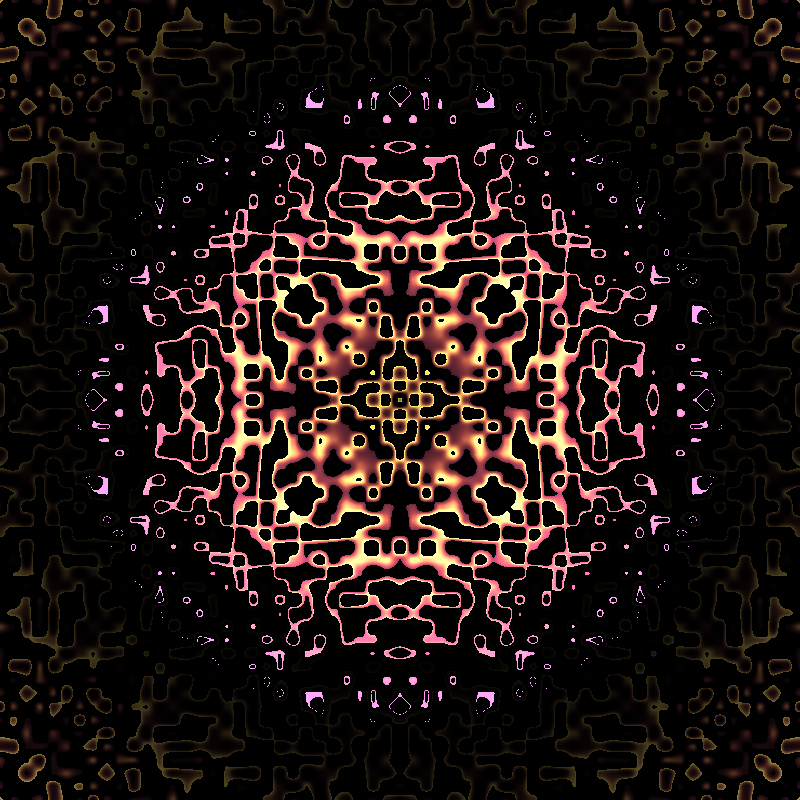 Patterns generated from pseudo moire function that computes unique designs based on fractional digits of trigonometic operations. There are some color variations also.