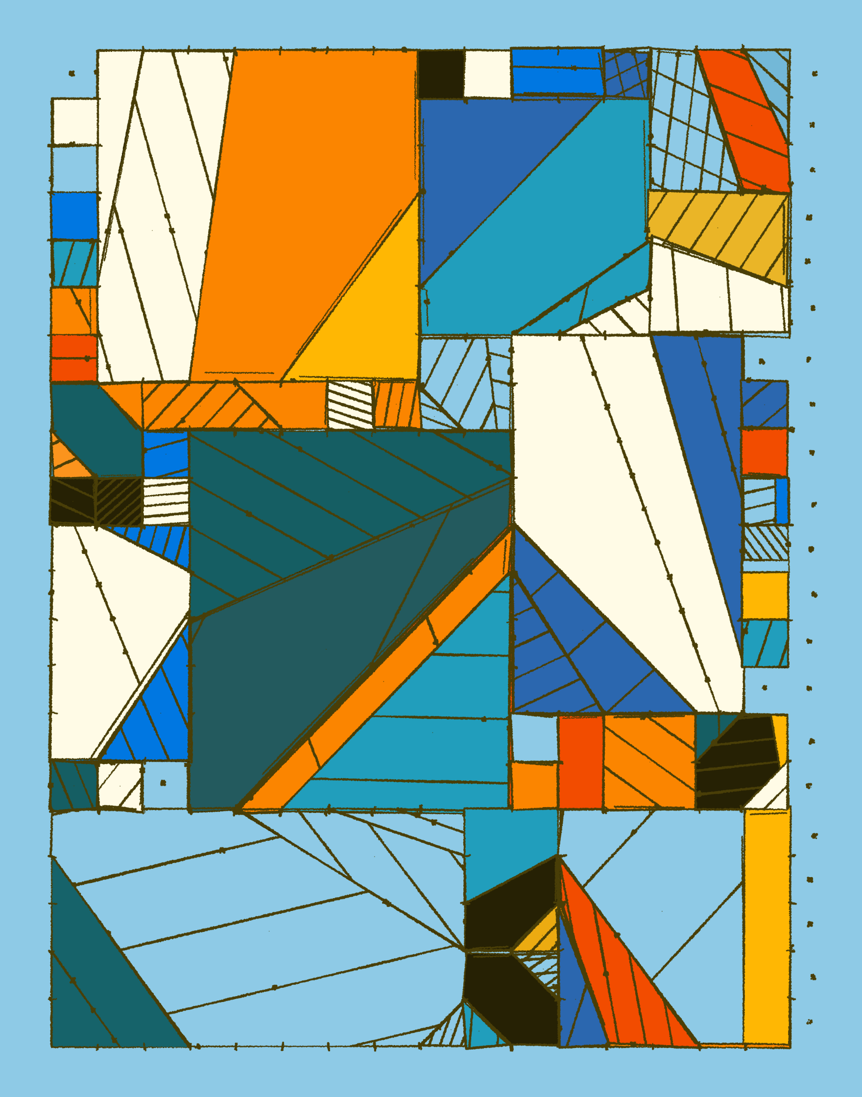 Somewhere in Between is a token that plays with geometry and color - reusing a previous algorithmic strategy for creating irregular grids, the main topic this time was splitting up rectangular regions in various manners. Each rectangle has a number of sockets distributed evenly along it's edges, these sockets can then be connected at random, without intersecting each other. Based on these connections we can then identify different polygonal regions with a contour walking approach. The rectangles are then split into these polygonal regions. That is the essence of this generative piece.