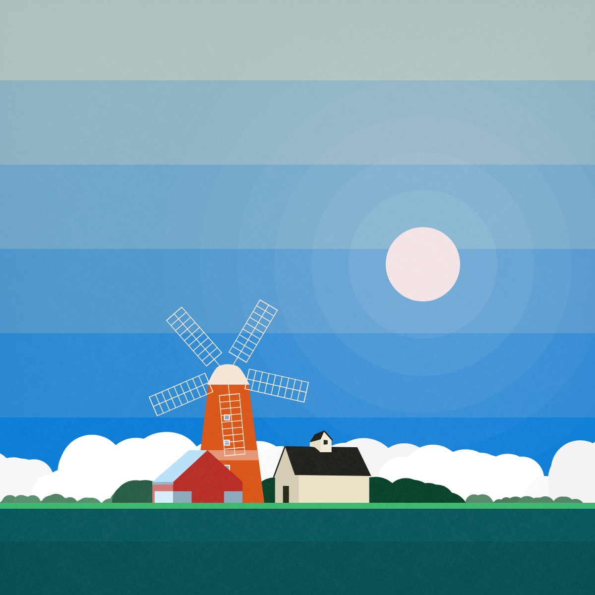 Continuing my exploration of abstract minimalism, this artwork is fully developed using p5js (100% code). Rural Places is a meditation in the form of abstract minimalism. There are 6 types of buildings and structures such as windmills and water towers and multiple houses with different structures and styles in this artwork. There are various arrangements and color palettes based on different times of the day.