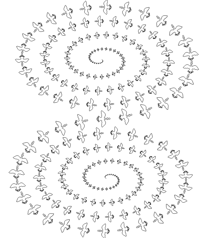 I am revisiting my original database of digitized creatures (frog, goose, elephant, and fat cat) that I used in my plotter drawing programs in the 1970s. My new program, Creature Spirals, is essentially half of my original plotter work called Coming and Going (1975). The program randomly selects a creature and then makes its iterations follow the path of two contiguous spiral paths. The creature and its copies are manipulated to be tangent to the curves, starting from one origin of one of the curves, scaling up as they traverse the curve, crossing over to the other curve, and scaling down as they recede back to their origin.