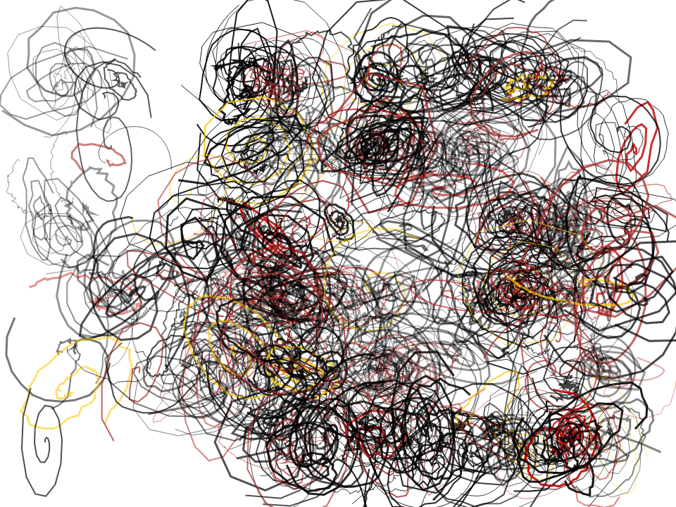 The visual elements of this piece are made up of randomly placed algorithmically drawn spirals or curls, which represent locks of hair. The number of turns, location, and rotation of each curl are all randomly determined. The total number of curls is arbitrary, but the color percentages of the curls will always be the same: 2% red, 5% blond, 11% brown or auburn, and 82% black or dark brown.