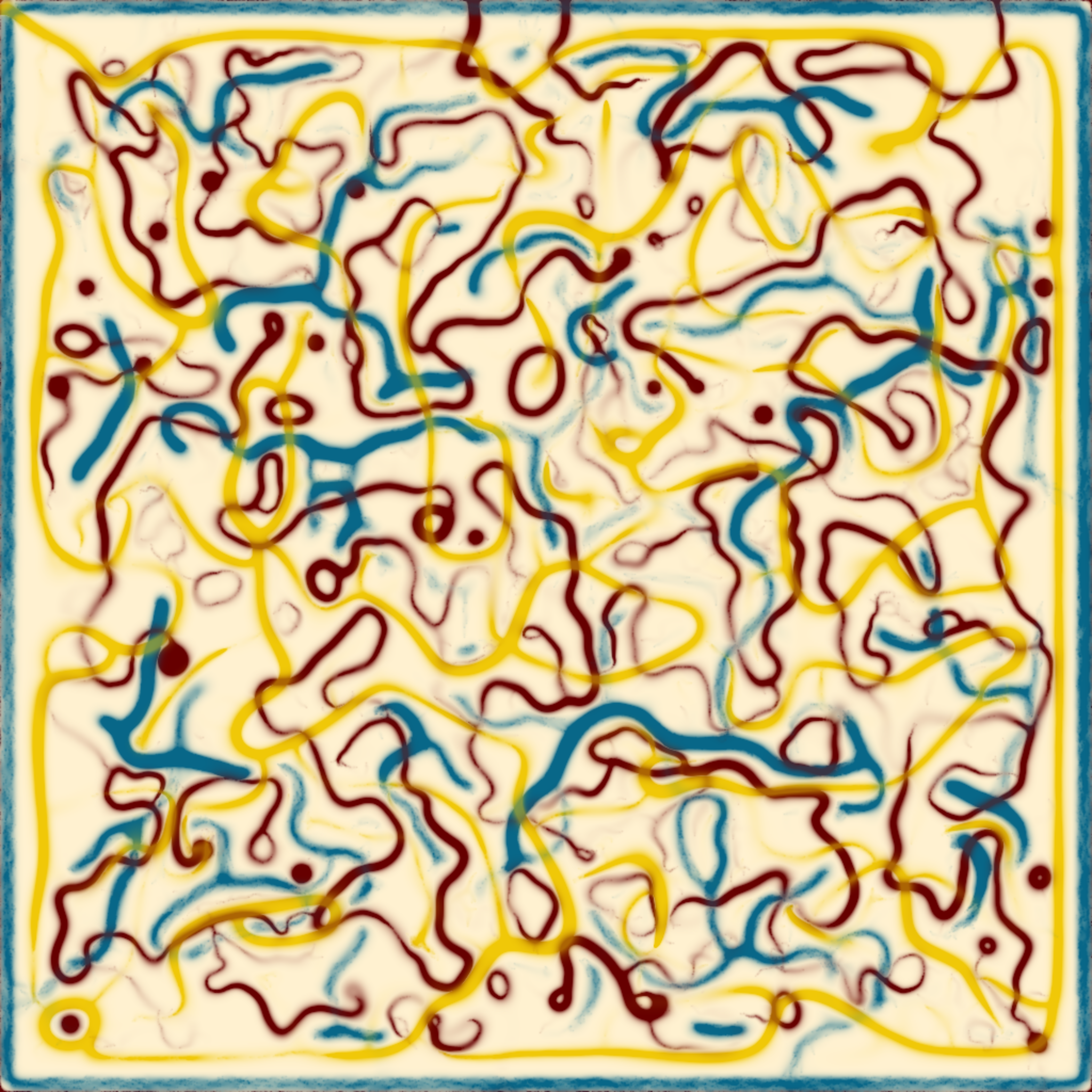 Using an implementation of a physarum slime mold model, I create three distinct groups of homogenous individuals, with each group having different sentiments towards the others. Individuals within a community make their best effort to follow each other around, and depending on group preferences try to either move towards or away from those in other groups.