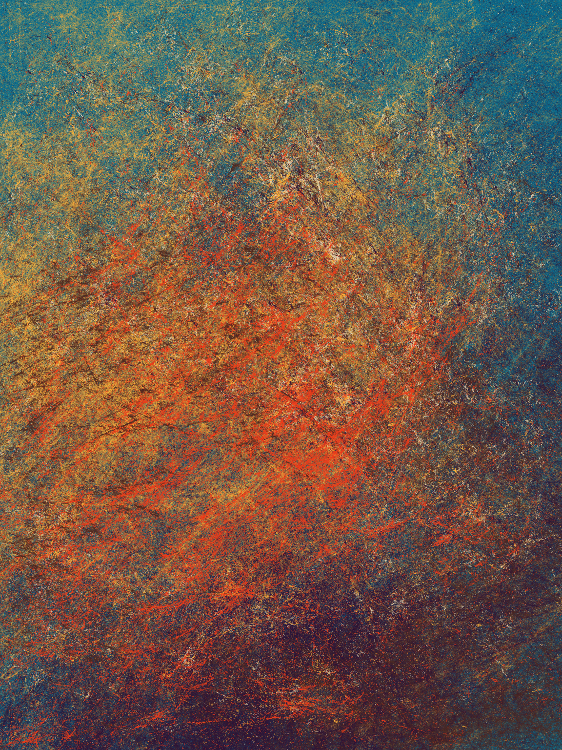The art piece is crafted by an algorithm simulating the effects of abrasion from a consistent yet dynamic process. It links a thousand pairs of points, harmoniously shifting across the canvas, with delicate lines. At each intersection of these lines, color is applied. To produce the final piece, multiple layers of varying colors and intensities are superimposed.