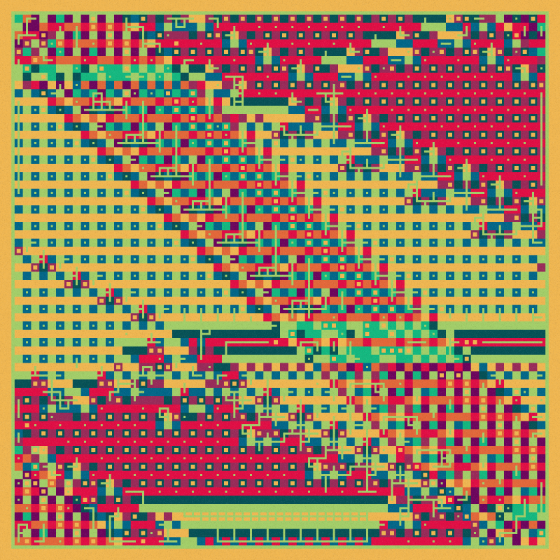 A two-dimensional cellular automata extracts details from the grid.