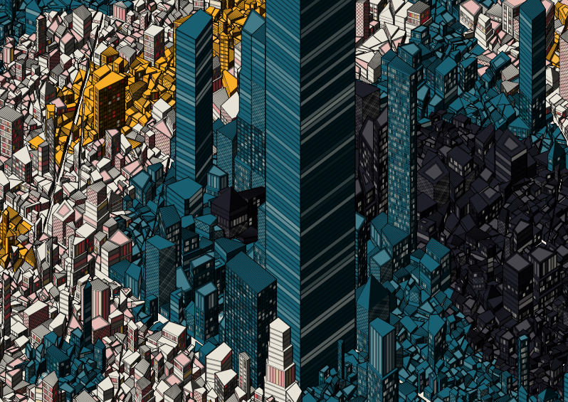 The work begins by gradually revealing the layout of the district. This process can take from about 6 seconds to as much as 2 minutes, but 50 to 60 seconds is typical. When this process is complete, the colors and facades will be added and the work revealed.