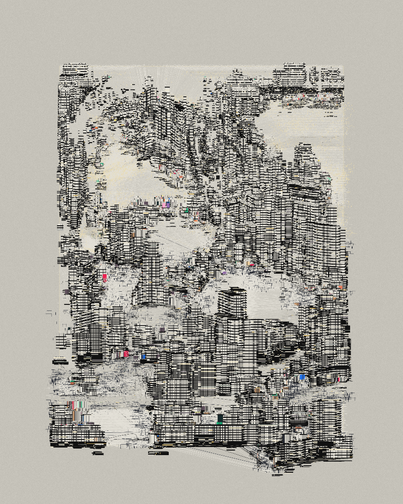 Implementing a loosely constrained algorithm, the work generates a unique composition of vectors, lines, and hatchings. Digital noise acts as a conductor, feeding these abstract elements, resulting in an intentionally modified "map" without a predetermined destination or definition.