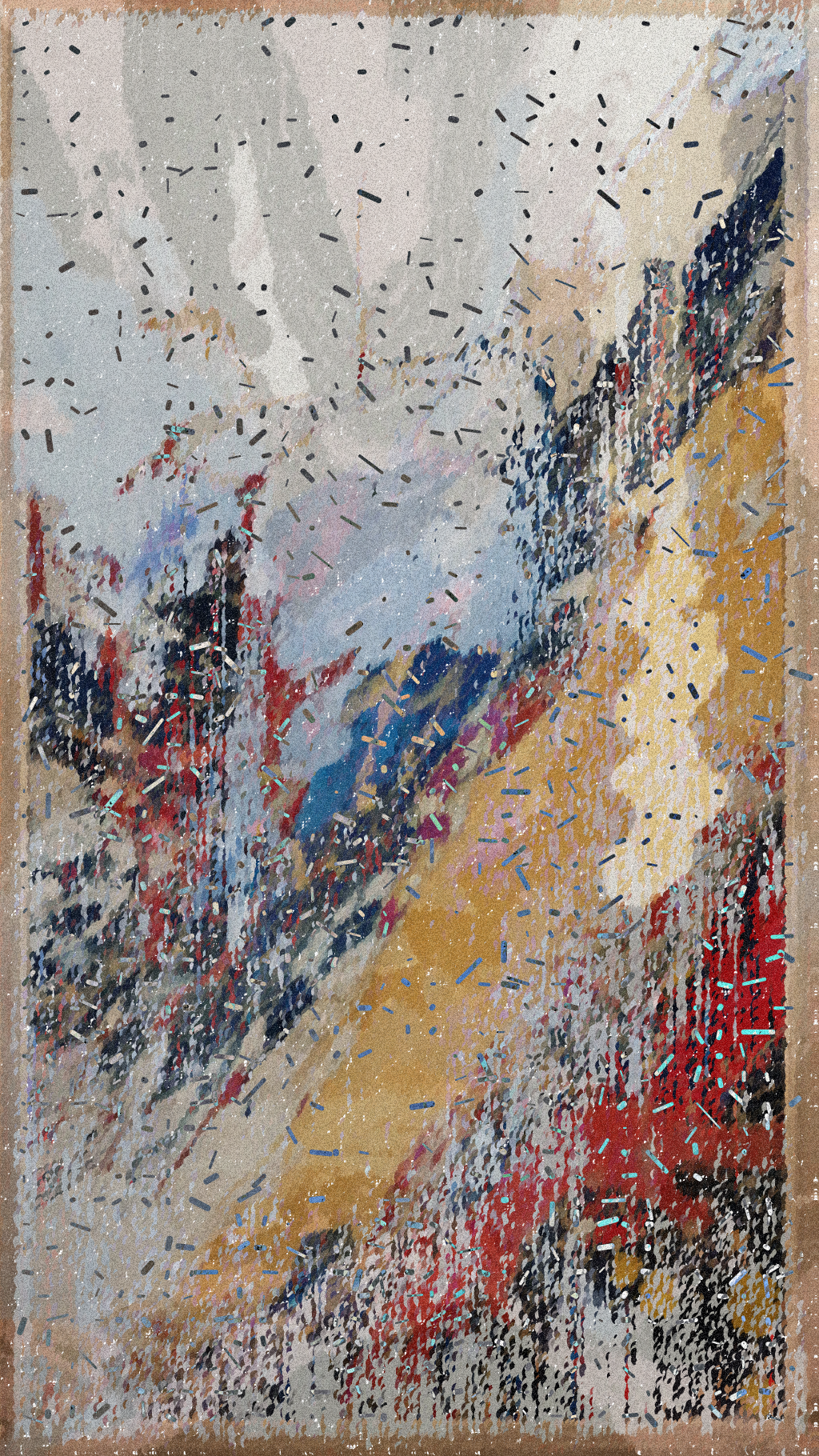 The artwork achieves a sense of depth through intricate compositions and a play of interacting layers. Over the abstract background, which inherits the plasticity and color palette from our previous works, we superimpose a regular grid, reminiscent of sweets and candy wrappers.