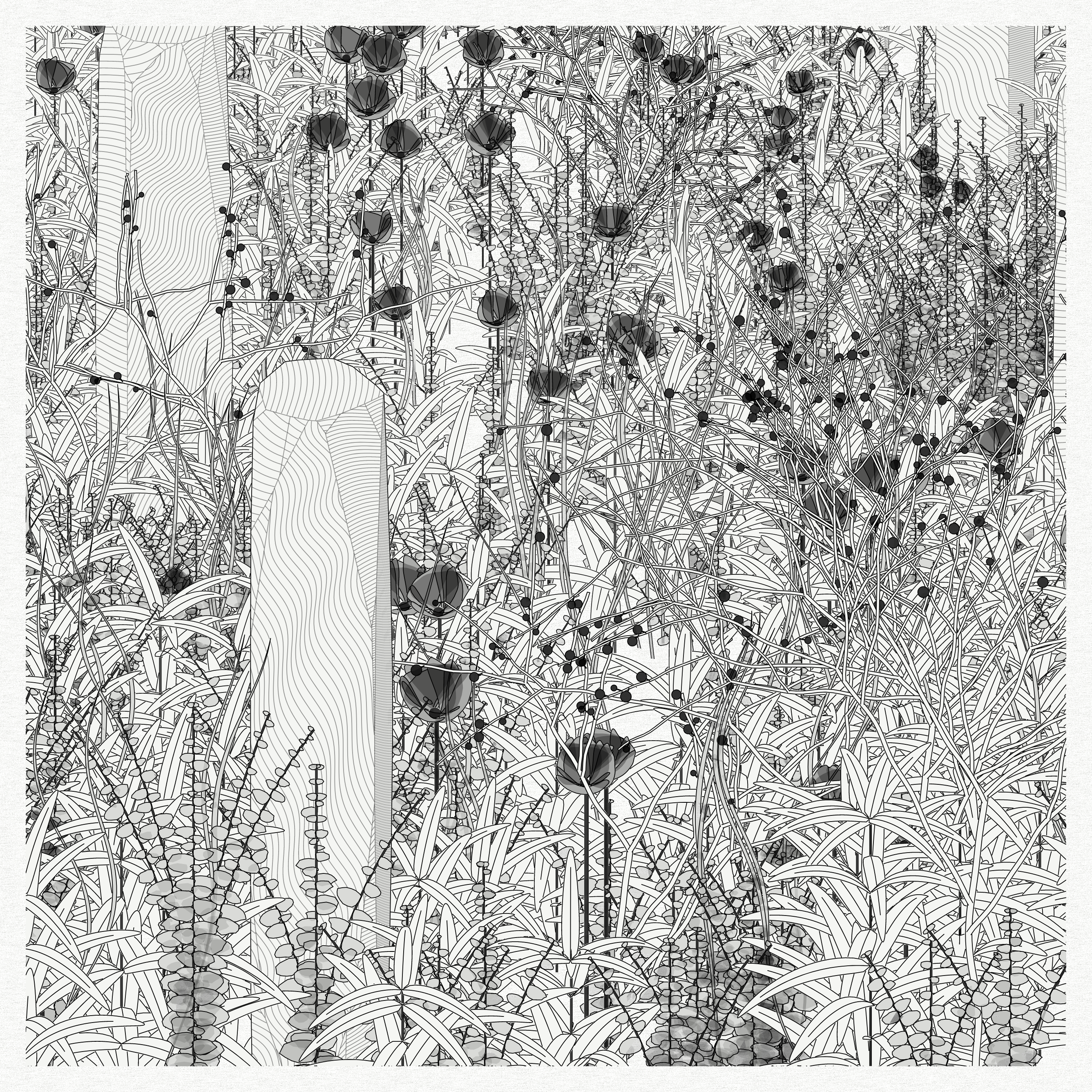 The initial goal was to use mathematical formulas for creating patterns inspired by the density of nature, that could be used by a pen plotter, so it kept focusing on outputting vector lines. This history and practice produced a graphical style based on line strokes, plus occasionally some transparent, filled shapes.