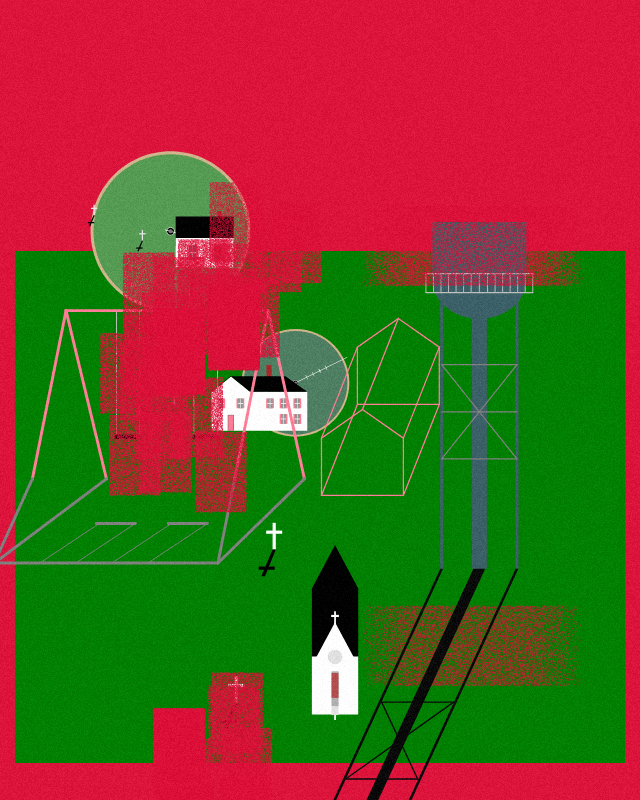 “Winesburg, Ohio” is an act of uncanny place-making. The collection borrows its name from a 1919 short-story cycle by Sherwood Anderson, which explores a peculiar cast of characters living within a fictionalized, midwestern town. Like Anderson’s text, the “Winesburg, Ohio” algorithm constructs a world through recurring portrayals of specific structures and landmarks. Its scenes are populated by a variety of familiar elements taken from my larger body of work, including water towers, houses, and churches. Meanwhile, a series of scripted gestures insert abstract compositional elements into the outputs, counteracting their pictorial legibility. The strange landscapes that result are composite ideograms, comprised of multiple spatial possibilities that co-exist in varying states of contradiction.