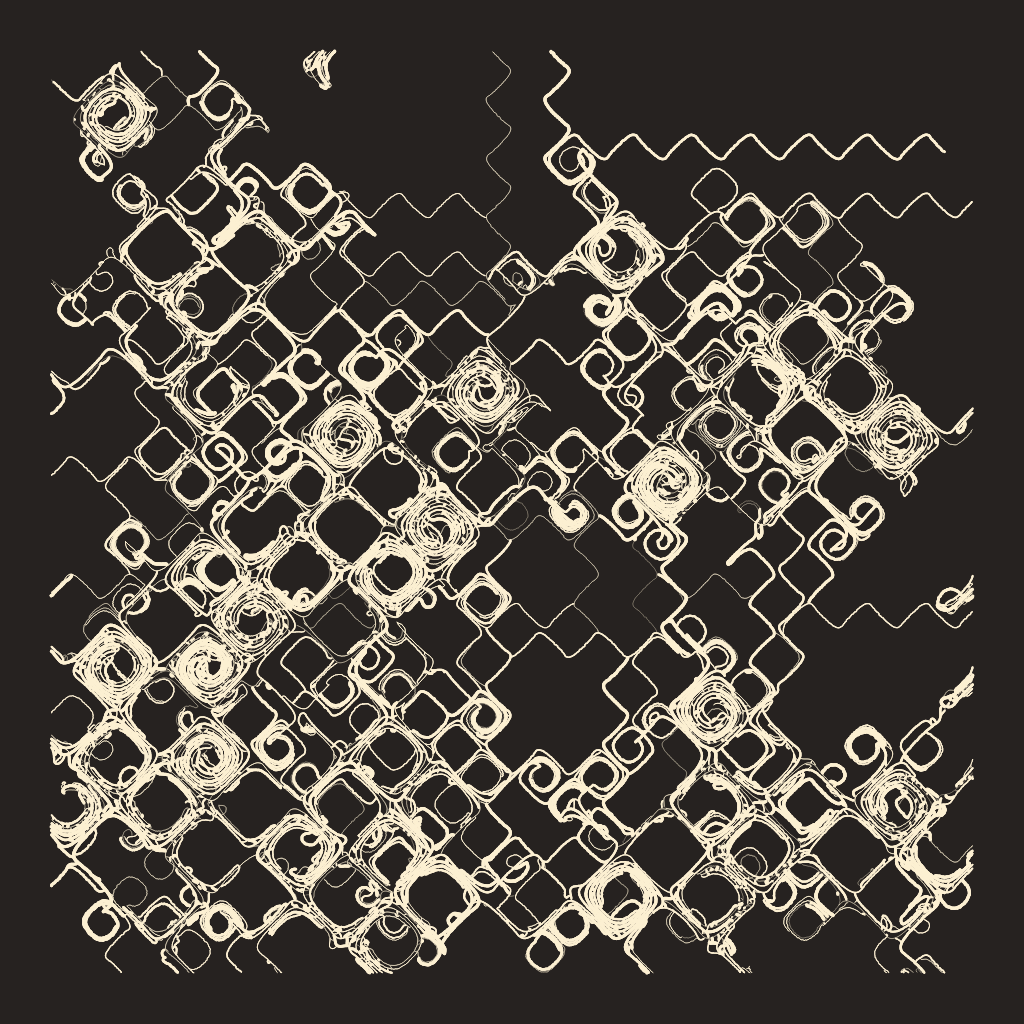 Or, you can think of this piece as just a bunch of lines, grown progressively using a process similar to Substrate (Jared Tarbell, 2003), modified with a vector field generated with trigonometric functions.