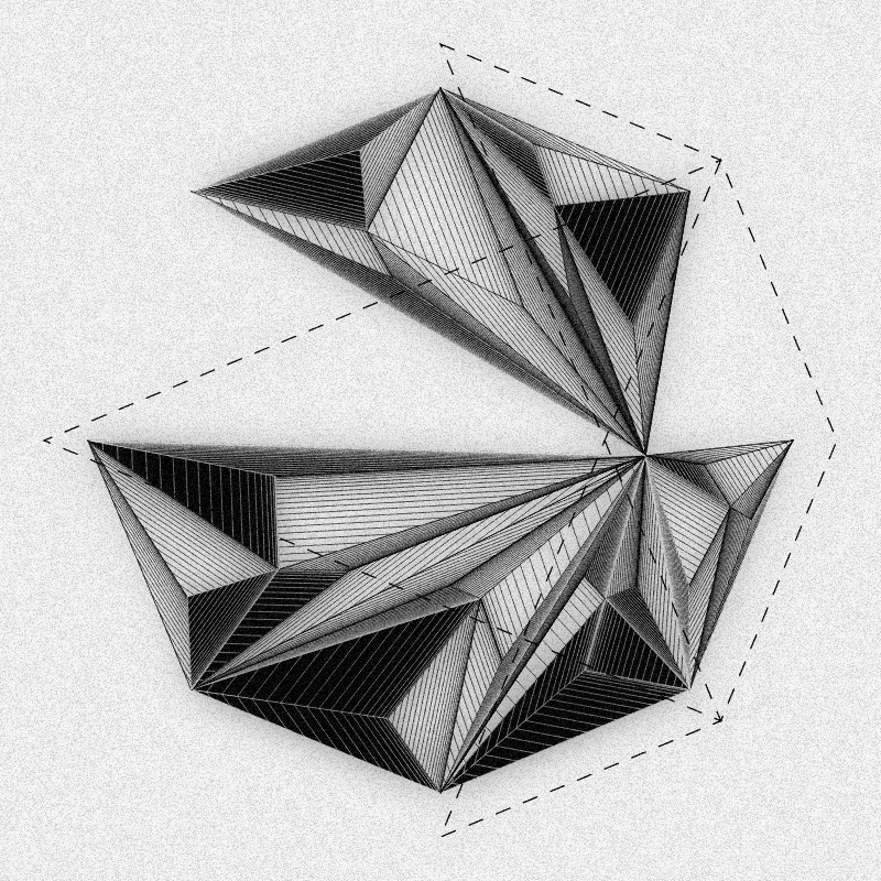 Starting from a simple and regular geometric shape, Fractures succeeds in breaking the initial visual monotony thanks to a recursive division system applied to the triangles of the initial polygon. Line patterns, random color inversions, grainy and charcoal effect are then added to give the final image a nice organic feel.