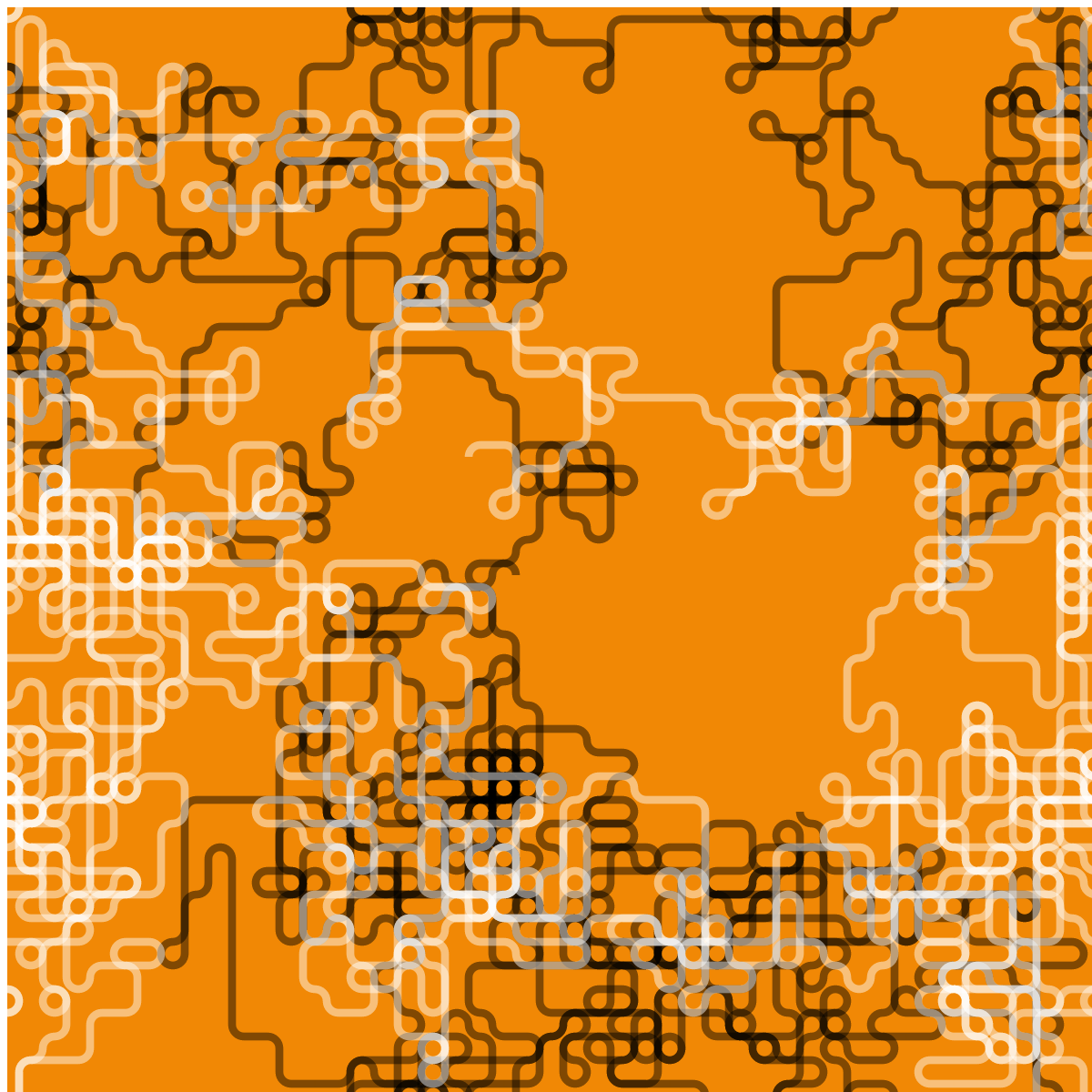Two random walkers with black and white footprints walks randomly across the map looking for something. They forget where they walked, so they often stomp on old footprints. The smaller the map cells, the more they have to walk