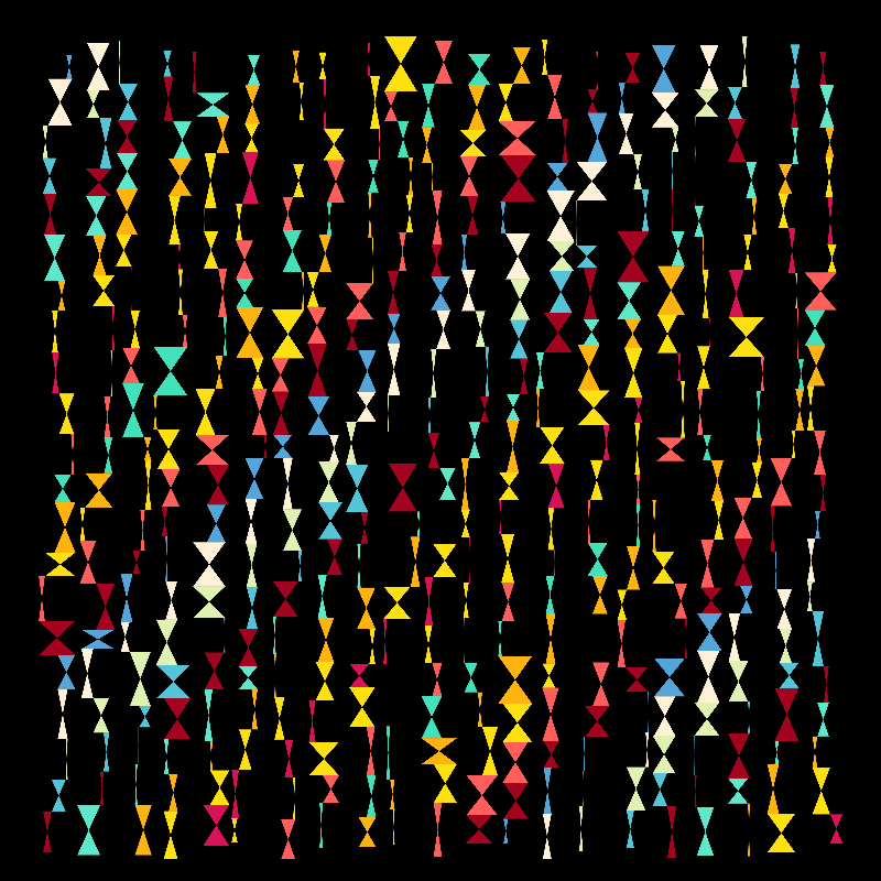 Rainbow Time is a generative art created with an hourglass shape with random colors. Generative is formed from rows and columns randomly.