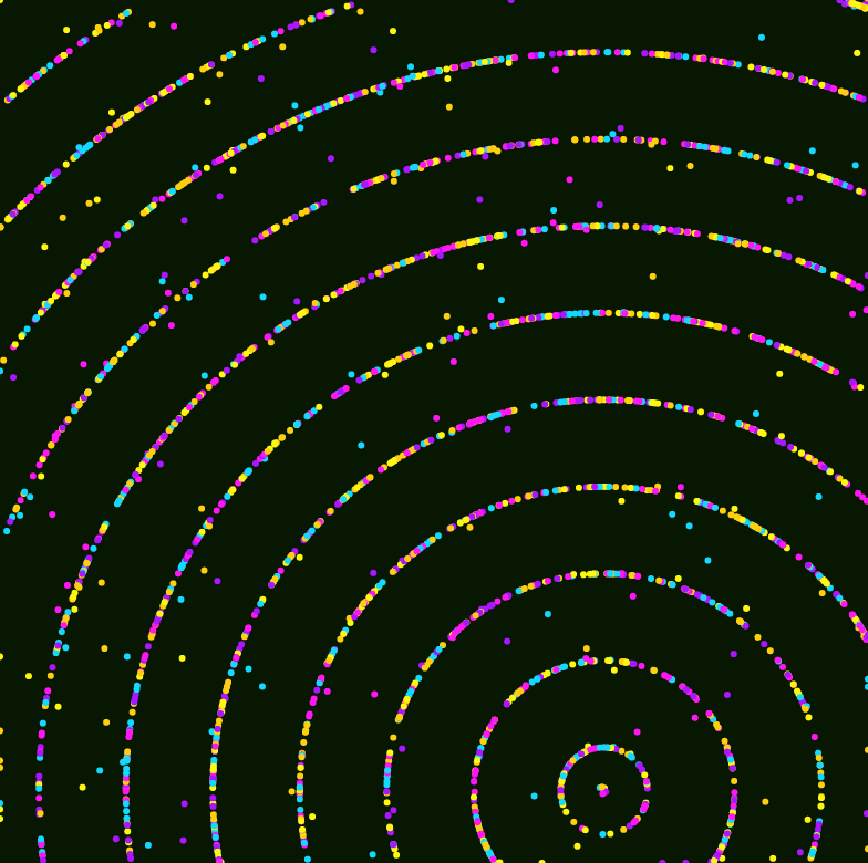 Semi-chaotic particles seeking organization in concentric random axis systems.
