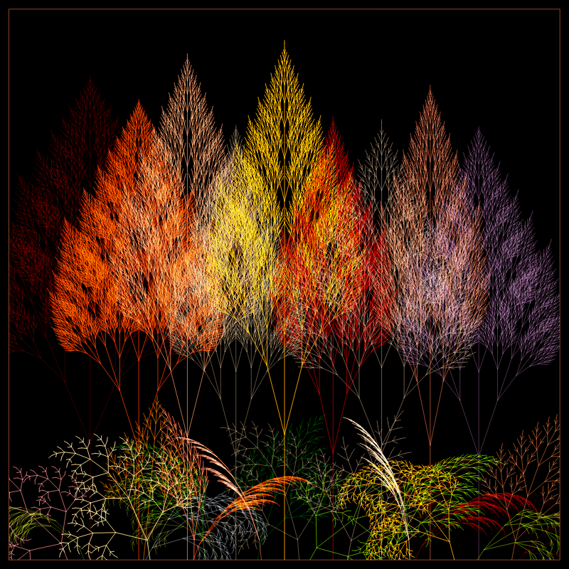 Every tree and grass here is a fractal generated by the method of iterative functional systems (IFS). Fractal detail depends on the size of the picture. Higher screen resolution => more beautiful fractal. Therefore, the resolution of the final image must be preferably bigger than 2000 pixels (e.g., 3000x3000 or 4000x4000 pixels). So after loading the standard size preview, press the key: