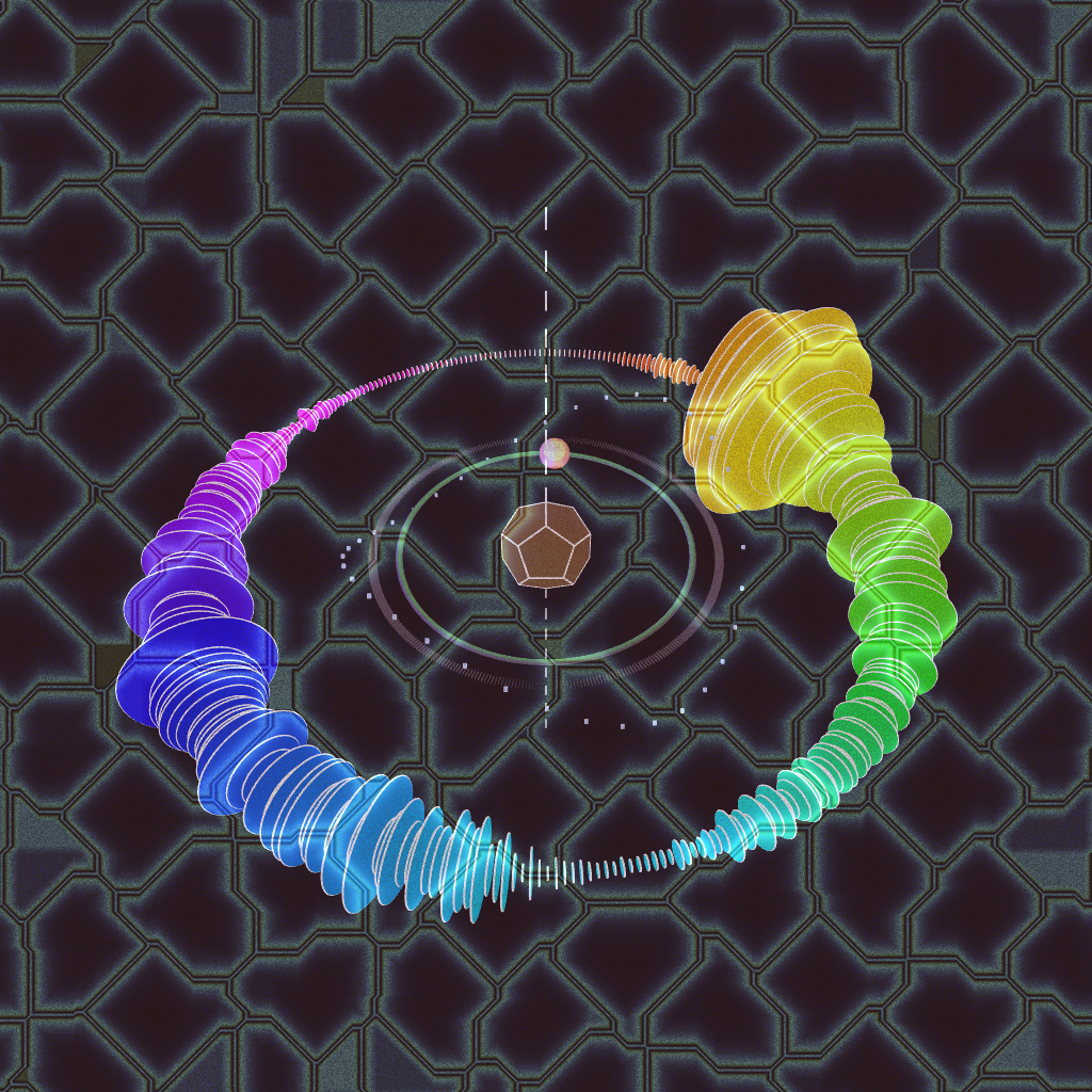 I recorded myself saying "Hello World" and converted the sound file to a set of amplitudes extracted from my voice. That set of amplitudes was then used to create a rotating set of discs that are orbiting a "Sun".