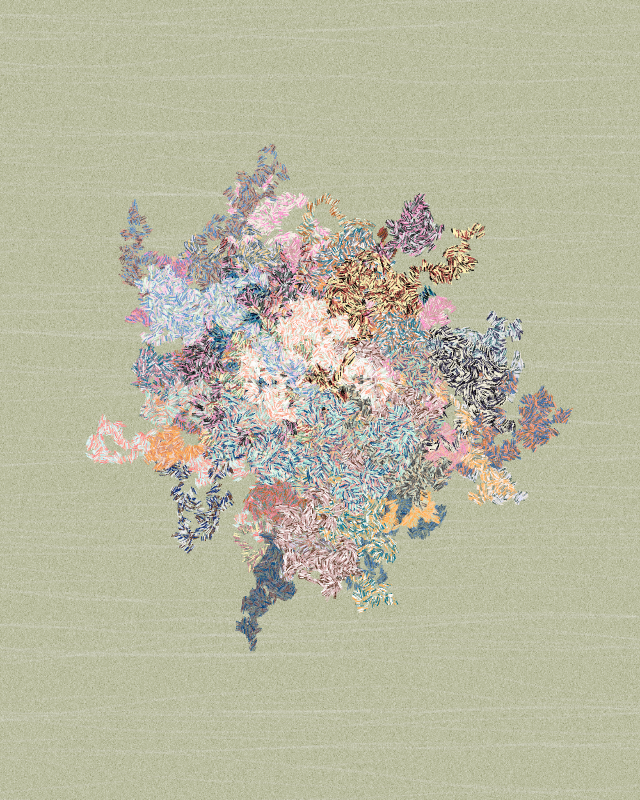 Each "protein" is made up of 100 pelts, random walking around the canvas from the center. Each "pelt" is made of 5 colors sampled from an array of 84 colors.