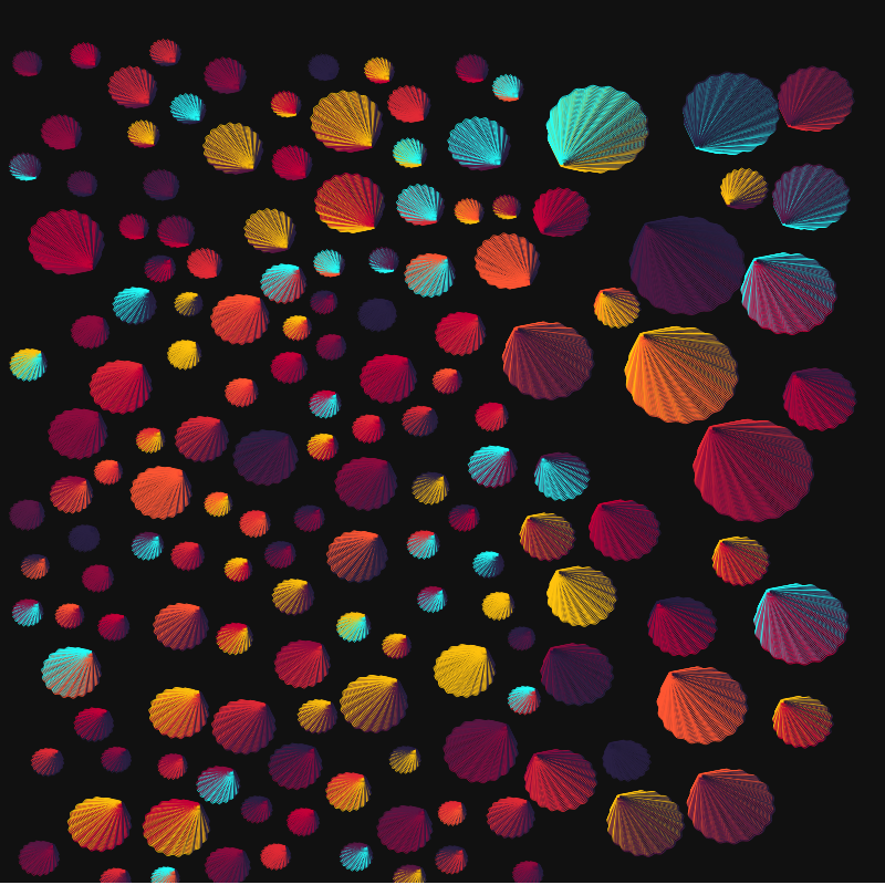 Chroma is a celebration of colors and seashells. Including a selection of 2 layouts (circle packing vs radial), 4 palettes, and thousands of size and position variations