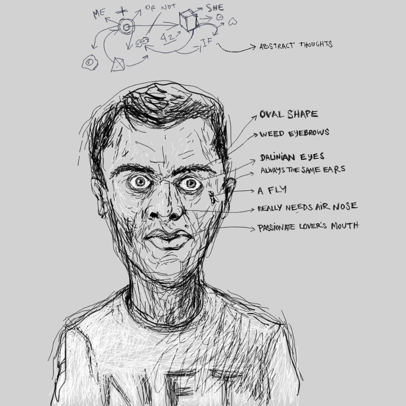 Combination of 3 shapes of heads with 3 noses with 3 mouths with 3 pair of eyes with 3 eyebrows with 3 thoughts with a fly or a crap and everything with its proper description!