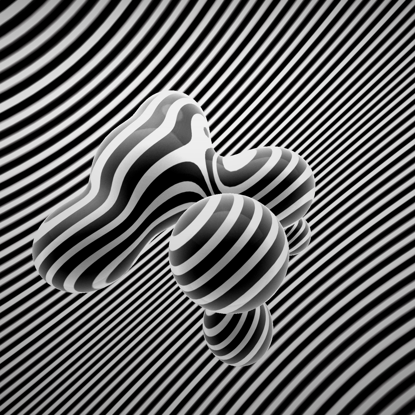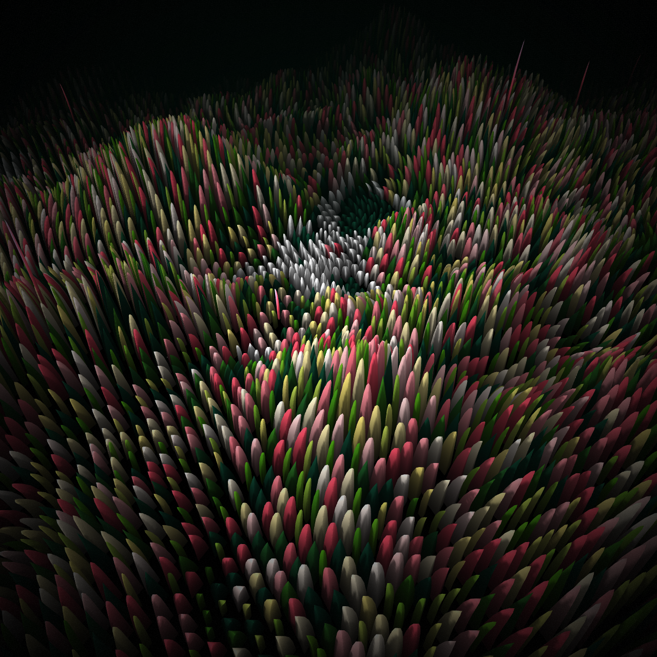 This time curl-noise is calculated to perform vertex displacement at the instanced-mesh level, which creates a wobbly effect on top of a bunch of distorted semi-spheres that had previously been distributed in 3D space on random positions in xz and fbm noise as a height map to provide the y positions.