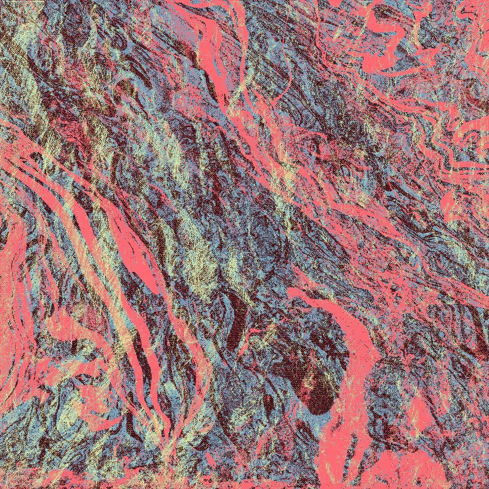 Seriscope Paintings are composed via a generative printing process similar to serigraphy (silkscreen). A number of abstract paintings were produced traditionally using a paper marbling technique and used as a dataset to combine 4 single-colour halftone layers to make the image.