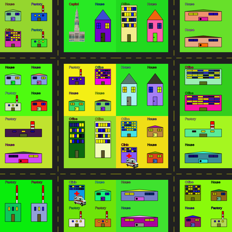 Number of different buildnigs - 6 (House, Office, Factory, Clinic, Police, Capitol)