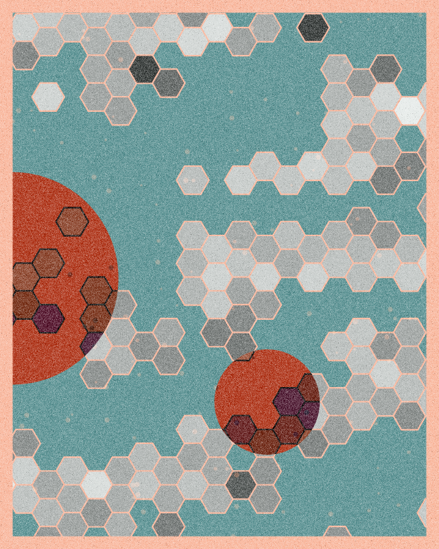 A piece stepping away from control and leaning into minimalism, there are several factors at play to make your Esagoni unique. Both of the two hexagon colors are a random RGB value, at various luminosities.